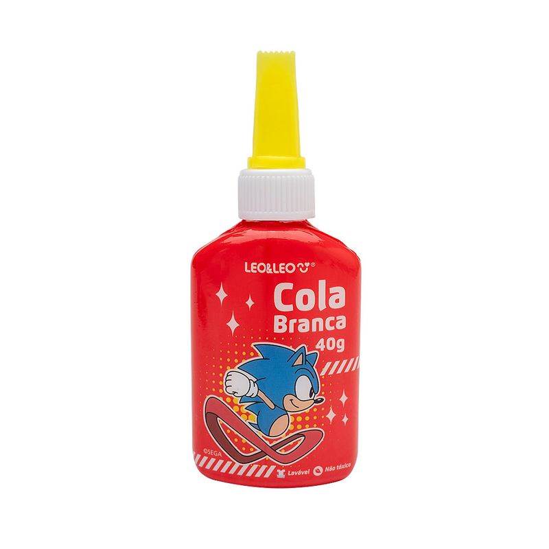 Com duas estampas e cores diferentes do personagem mais veloz do mundo, o ouriço azul Sonic, a cola é líquida, de cor branca, com bico dosador e tampa antivazamento.