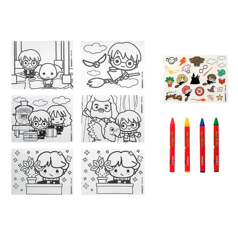 Cada kit contém 4 gizes de cera coloridos, 2 desenhos exclusivos para colorir, 1 cartela de adesivos decorativos e 1 chaveiro surpresa temático com personagens do mundo bruxo de Harry Potter. A grande diversão está na surpresa: a criança só descobre qual personagem veio na cápsula ao abrir o kit.