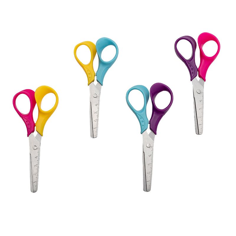 São 4 combinações de cores vibrantes e divertidas: roxo e rosa, azul e amarelo, azul e roxo, amarelo e rosa, o que torna o momento de cortar papel em sala de aula em algo muito alegre e colorido.